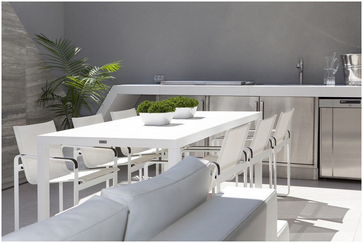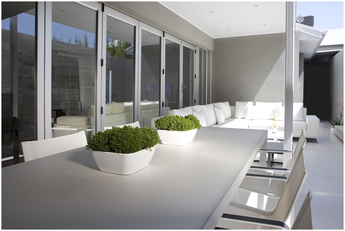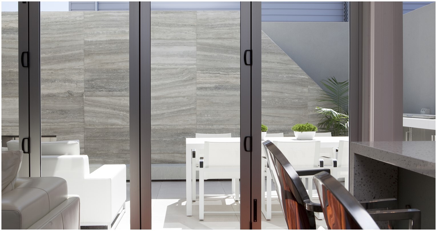 THE FOCAL POINT BECAME THE LARGE FEATURE WALL DRESSED WITH LARGE TRAVERTINE TILES IN SOFT EARTHY COLOURS AND GREY UNDERTONES, STRATEGICALLY PLACING AN OUTDOOR HEATER ALMOST ADORNING THE WALL LIKE A PAINTING MEANT ALL-ROUND SEASONAL ENTERTAINING. LARGE ITALIAN TILES IN A WHITE SLIGHTLY SPECKLED FINISH WHERE LAID ON THE FLOOR TO MAKE THE SPACE SEEM LARGER AND GAVE THE SPACE A SLEEK STREAMLINED LOOK. AN ABSTRACT WHITE STONE ISLAND BBQ AREA WAS DESIGNED AND EQUIPPED WITH BAR ESSENTIALS.